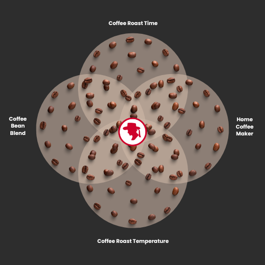 Custom coffee roasting starts with your home coffee maker. At Peak Flavor Coffee, we adjust the time and the temperature in our roast profile to fit a blend of naturally sweet coffee beans to your home coffee maker. To get a match, we choose a coffee roasting profile to deliver a custom coffee roast with which your home coffee maker can extract naturally sweet, mild, and creamy coffee. As illustrated below, our small-scale, custom coffee roasting hits the coffee sweet spot for your home coffee machine.